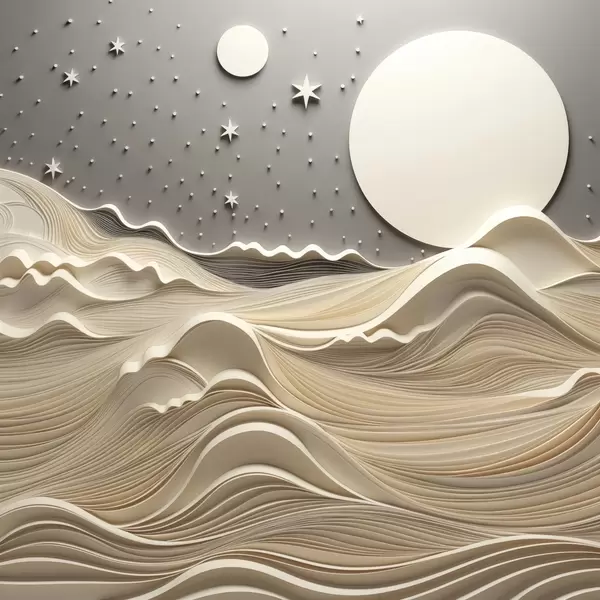 Poster Een minimalistisch, gestileerd landschap met glooiende heuvels en een grote maan aan een sterrenhemel, abstracte kunst Nr f48401