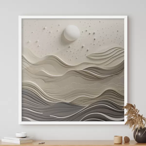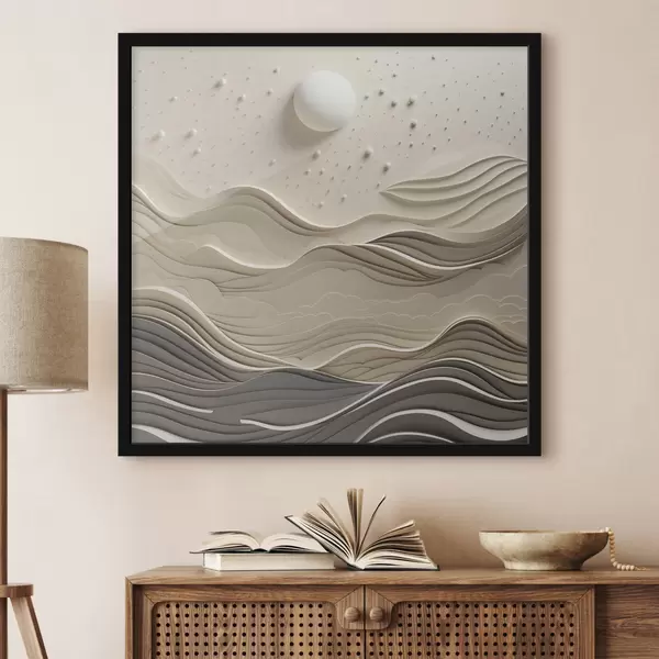 Poster Een minimalistisch, gestileerd landschap met glooiende heuvels en een grote maan aan een sterrenhemel, abstracte kunst Nr f48402