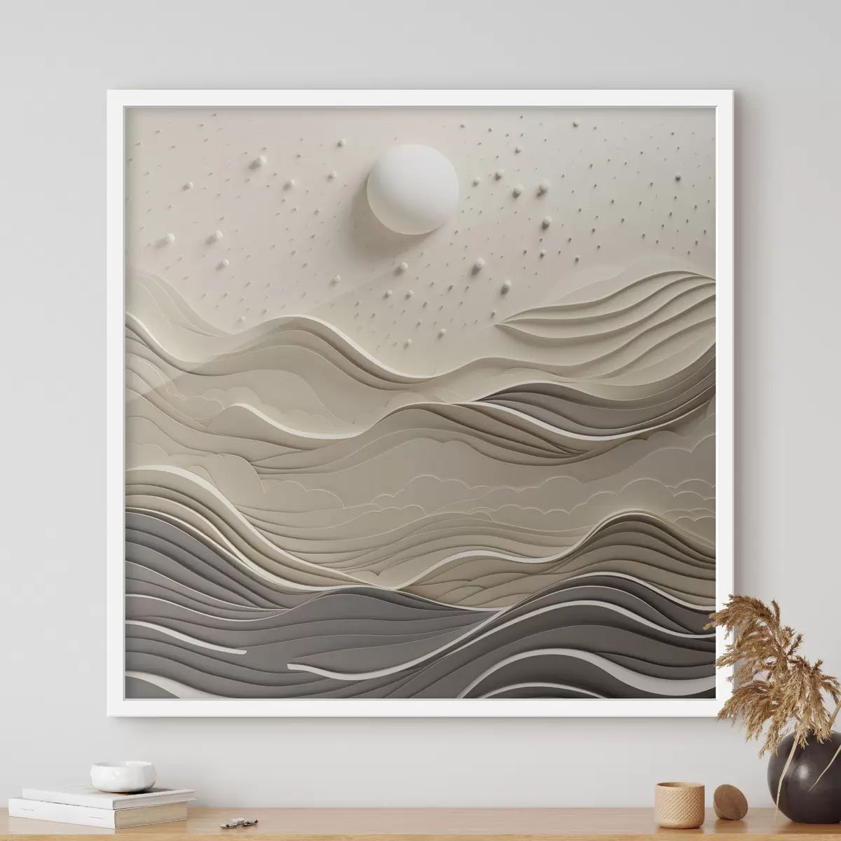 Poster Een minimalistisch, gestileerd landschap met glooiende heuvels en een grote maan aan een sterrenhemel, abstracte kunst f48402