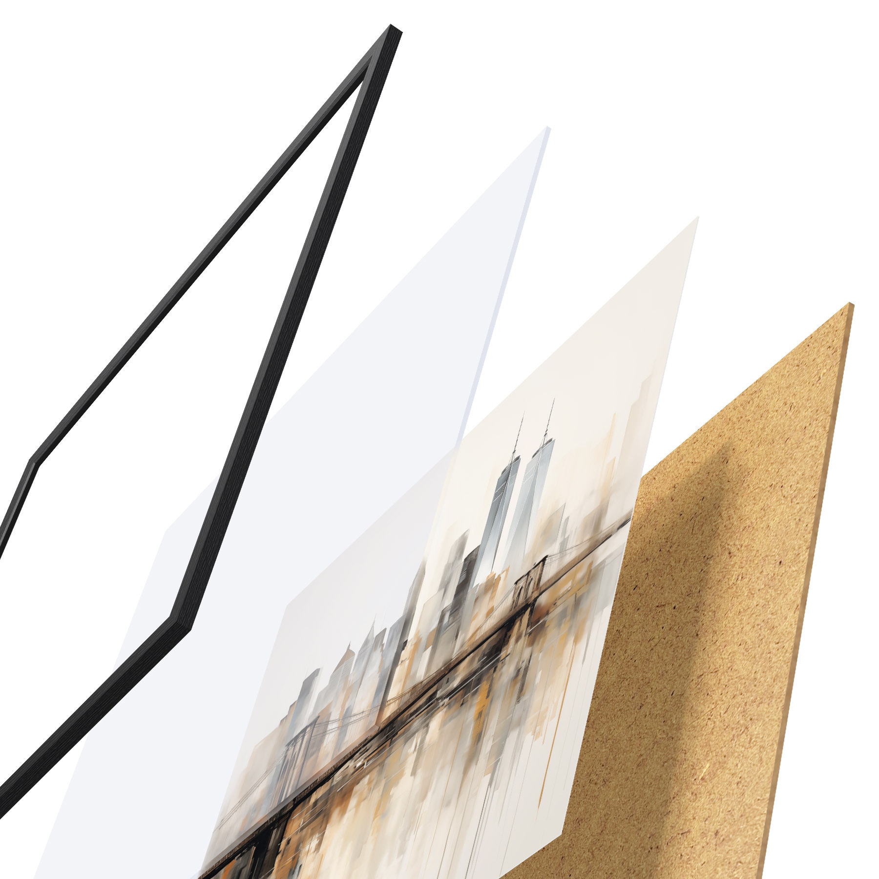 De poster bestaat uit een frame, plexiglas, geprinte afbeelding en spaanplaat achterkant. De poster kan meteen aan de muur worden gehangen dankzij de bevestigingen op de achterkant.