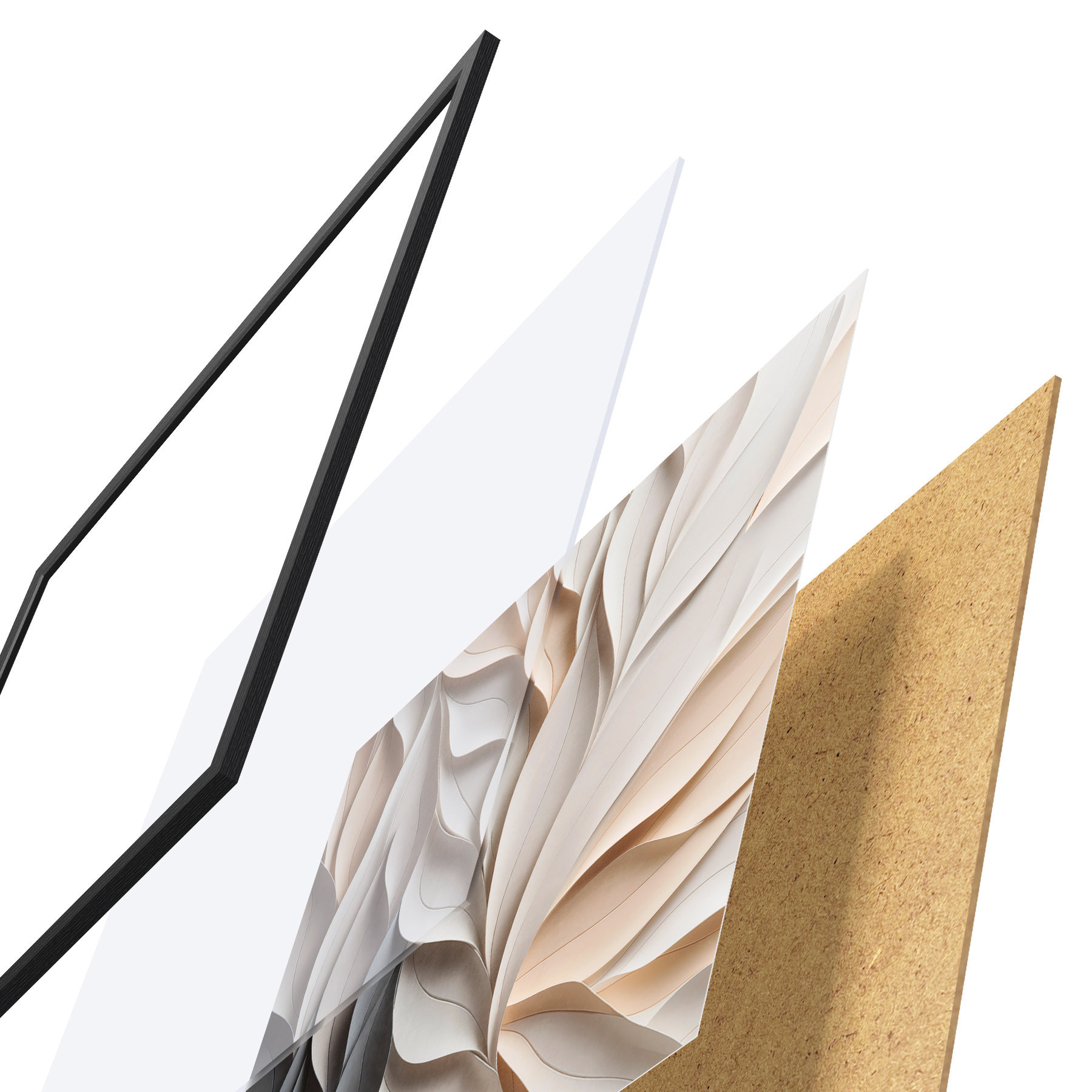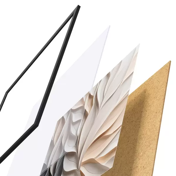 De poster bestaat uit een frame, plexiglas, geprinte afbeelding en spaanplaat achterkant. De poster kan meteen aan de muur worden gehangen dankzij de bevestigingen op de achterkant.