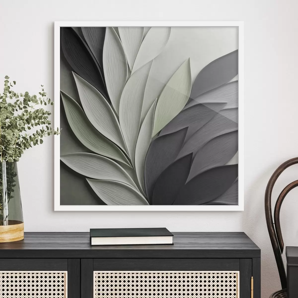 Poster Abstracte, gestileerde bladeren in grijstinten, wit en gedempt groen Nr f48411