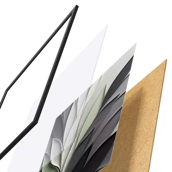 De poster bestaat uit een frame, plexiglas, geprinte afbeelding en spaanplaat achterkant. De poster kan meteen aan de muur worden gehangen dankzij de bevestigingen op de achterkant.