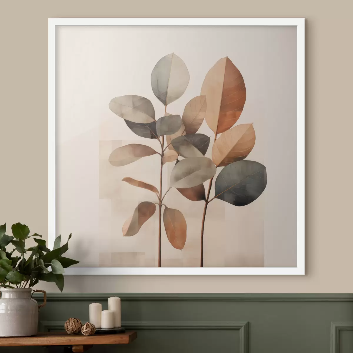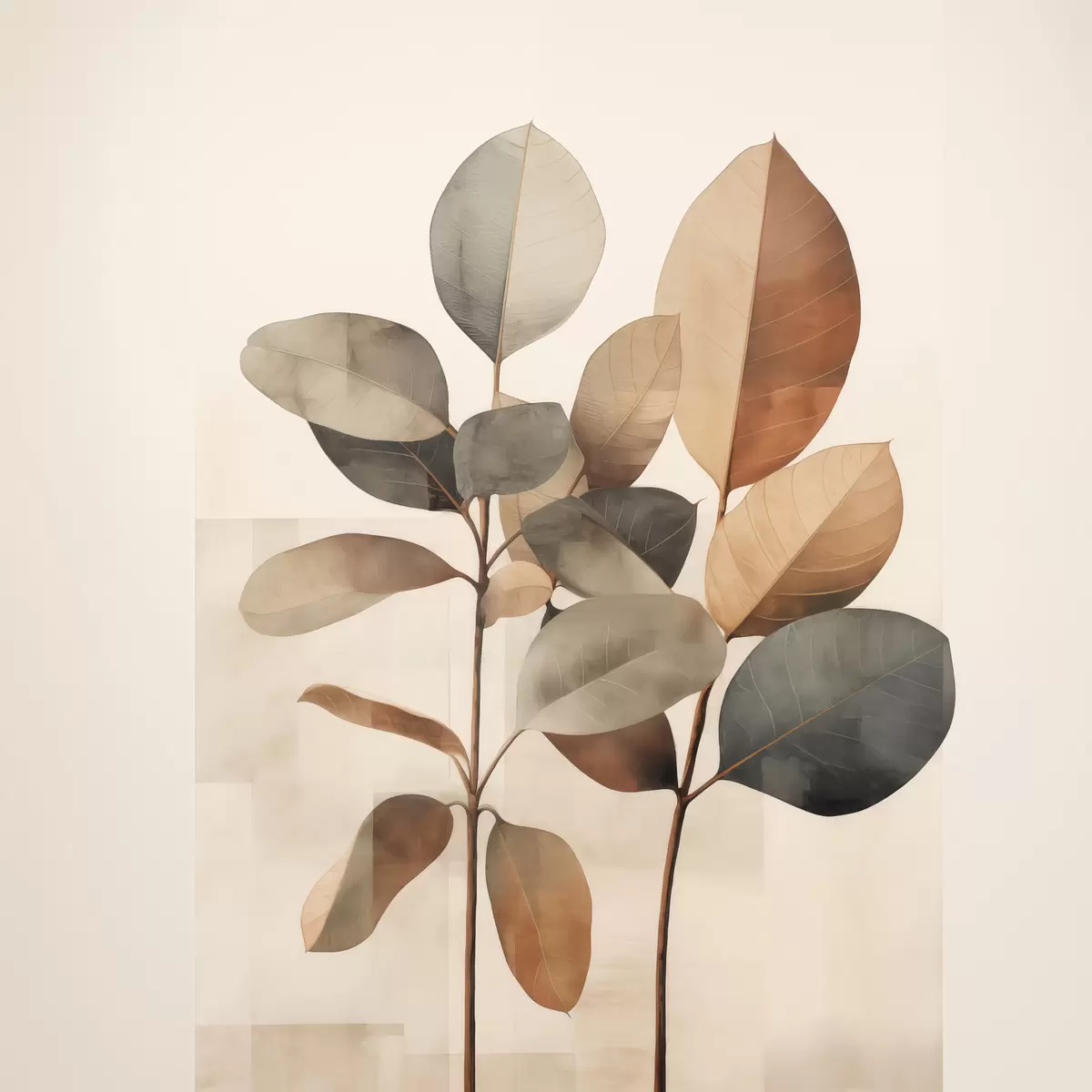 Poster Hoge planten met ovale bladeren in ingetogen tinten en abstracte rechthoekige vormen Nr f48413
