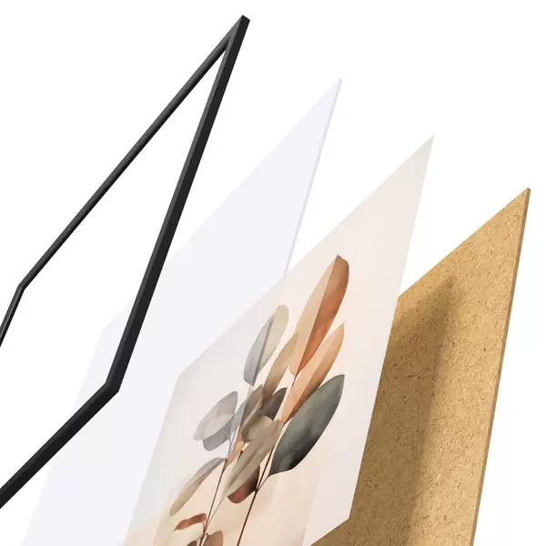 De poster bestaat uit een frame, plexiglas, geprinte afbeelding en spaanplaat achterkant. De poster kan meteen aan de muur worden gehangen dankzij de bevestigingen op de achterkant.