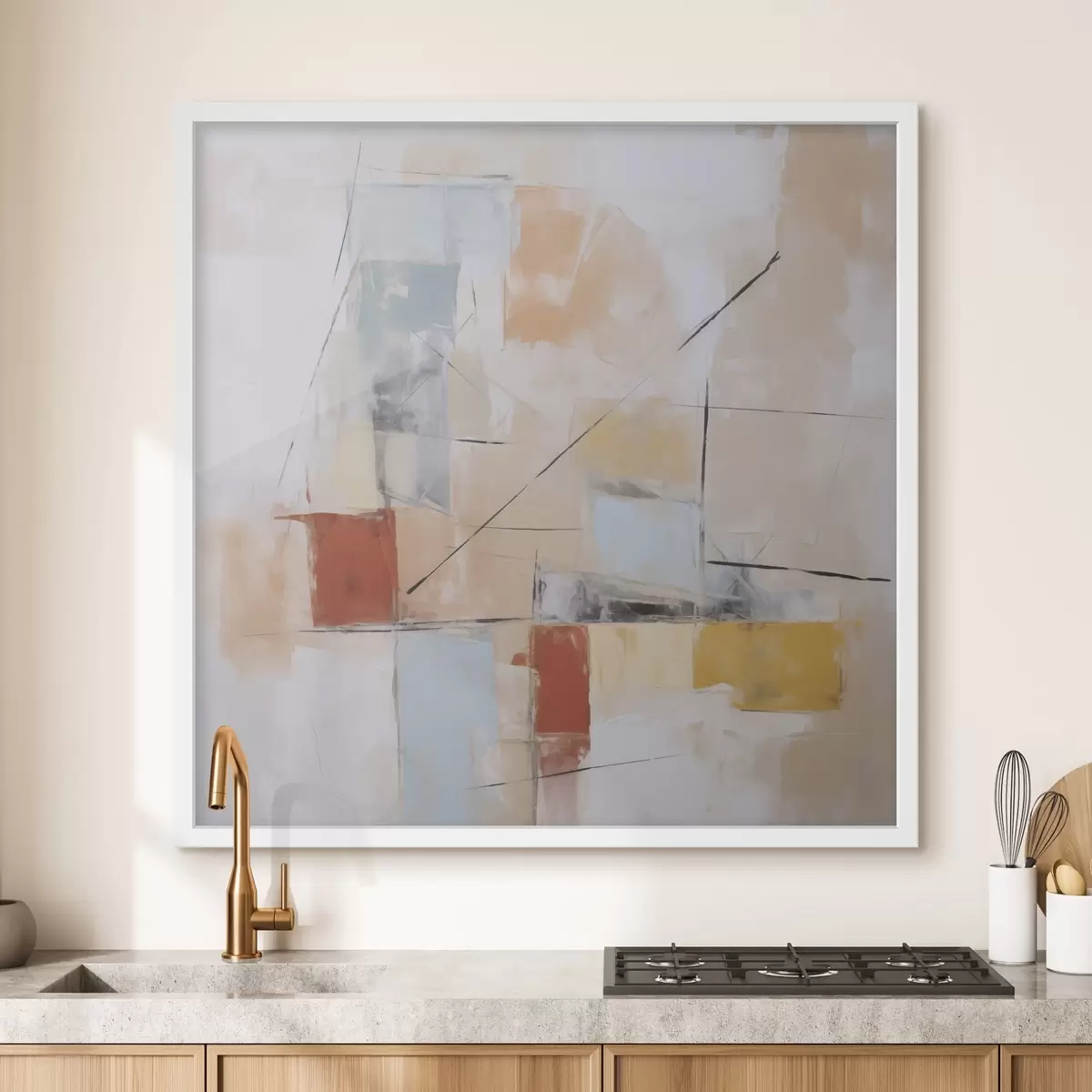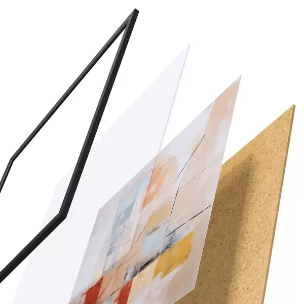 De poster bestaat uit een frame, plexiglas, geprinte afbeelding en spaanplaat achterkant. De poster kan meteen aan de muur worden gehangen dankzij de bevestigingen op de achterkant.