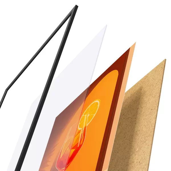 De poster bestaat uit een frame, plexiglas, geprinte afbeelding en spaanplaat achterkant. De poster kan meteen aan de muur worden gehangen dankzij de bevestigingen op de achterkant.