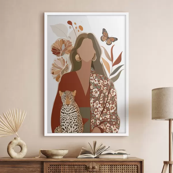 Poster Vrouw tegen een bloemenachtergrond f48435
