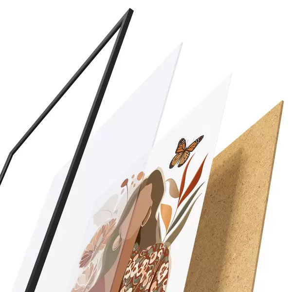 De poster bestaat uit een frame, plexiglas, geprinte afbeelding en spaanplaat achterkant. De poster kan meteen aan de muur worden gehangen dankzij de bevestigingen op de achterkant.