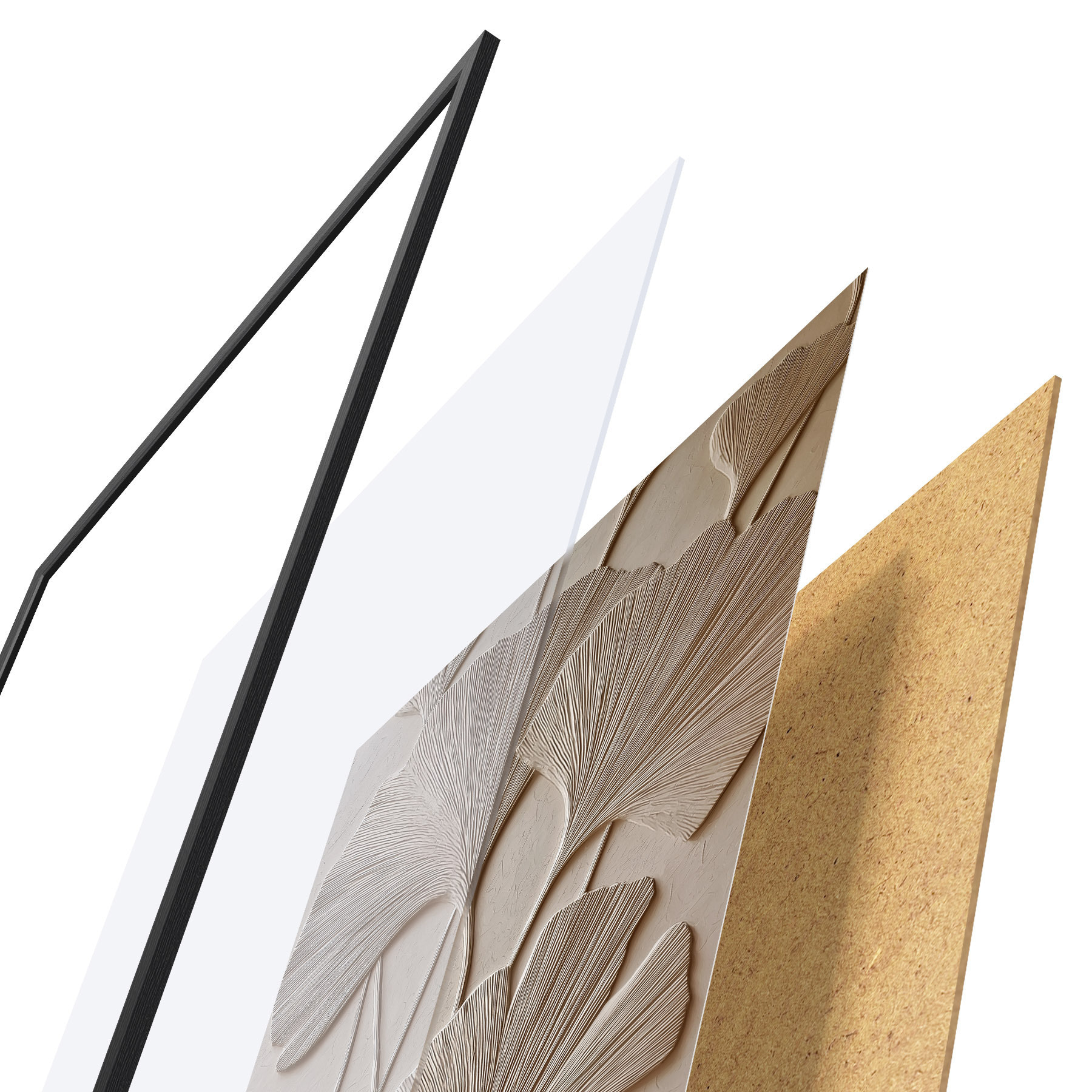 De poster bestaat uit een frame, plexiglas, geprinte afbeelding en spaanplaat achterkant. De poster kan meteen aan de muur worden gehangen dankzij de bevestigingen op de achterkant.