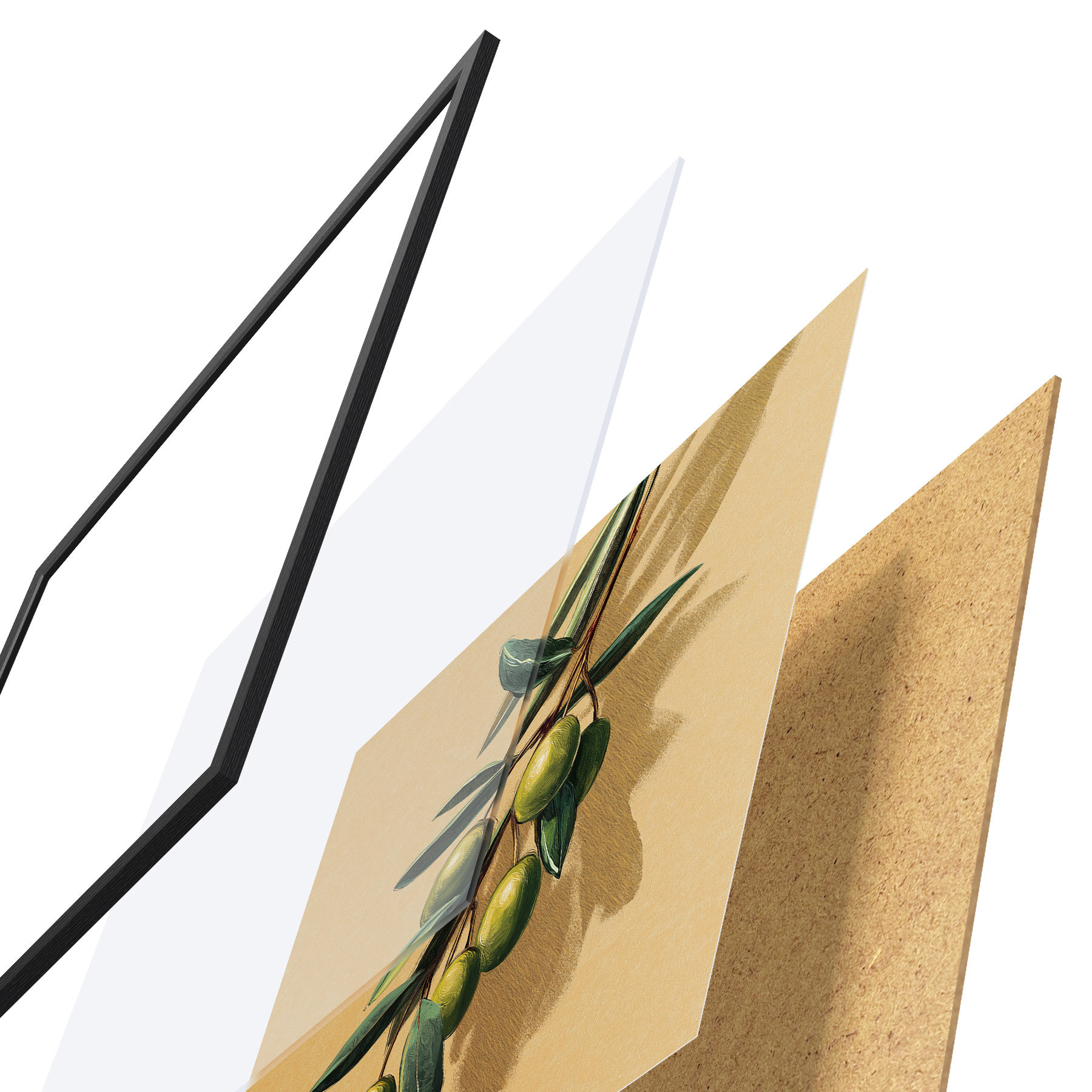 De poster bestaat uit een frame, plexiglas, geprinte afbeelding en spaanplaat achterkant. De poster kan meteen aan de muur worden gehangen dankzij de bevestigingen op de achterkant.