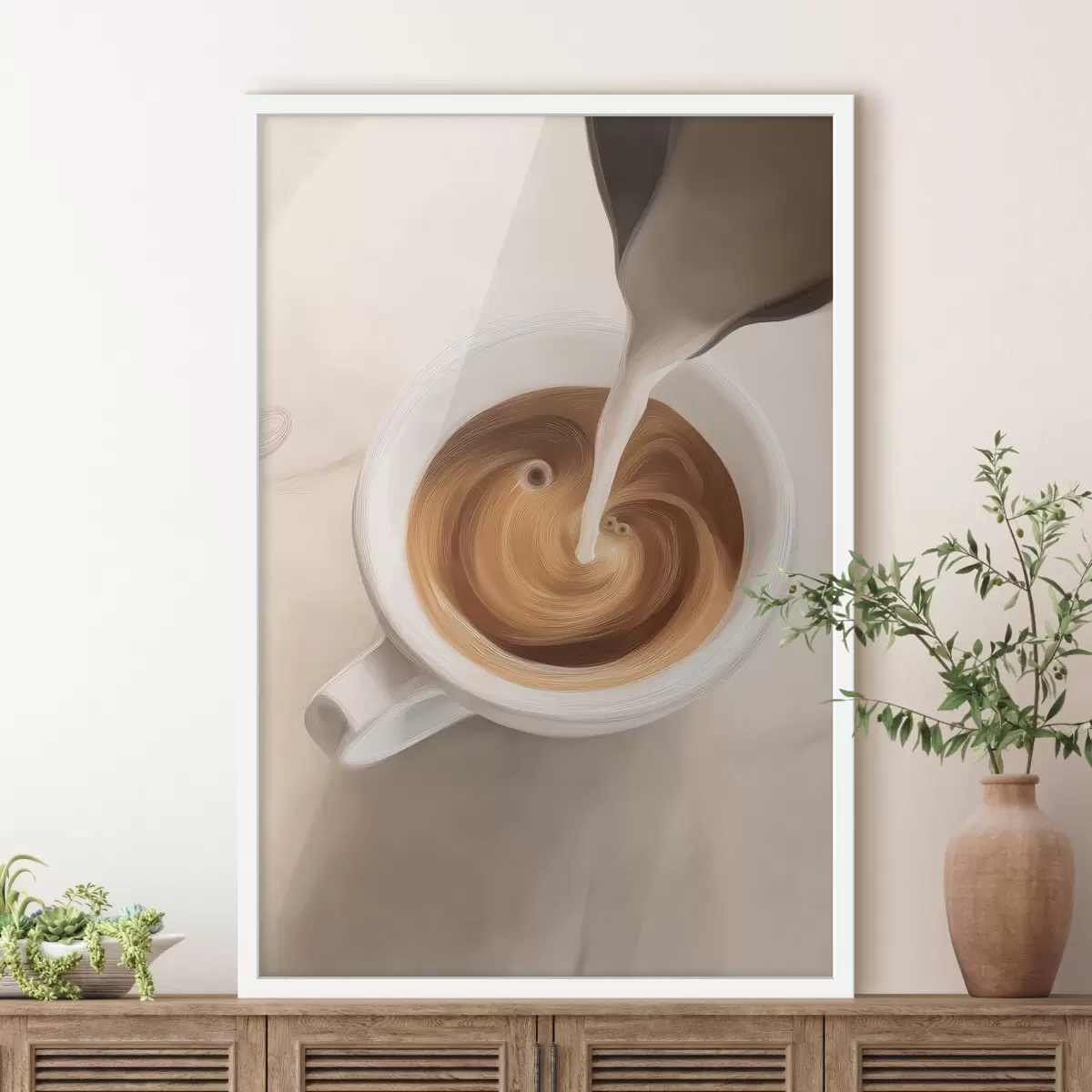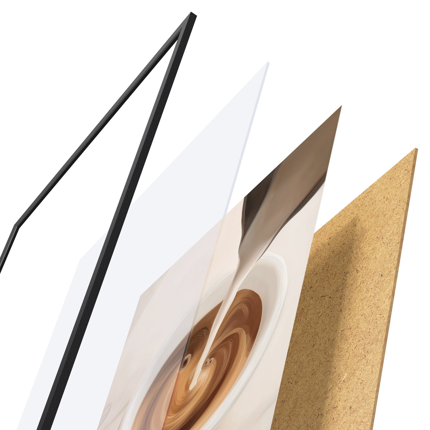 De poster bestaat uit een frame, plexiglas, geprinte afbeelding en spaanplaat achterkant. De poster kan meteen aan de muur worden gehangen dankzij de bevestigingen op de achterkant.