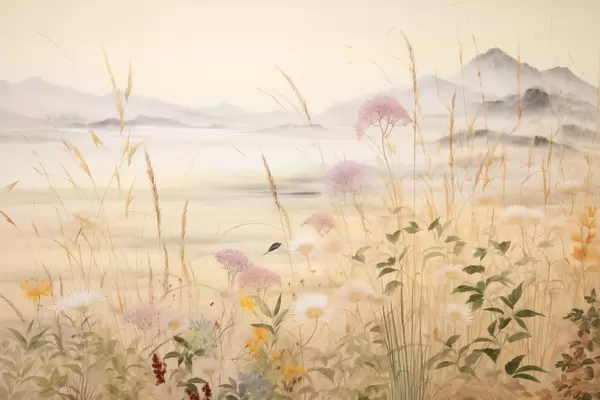 Poster Beige bloemenveld, weidegrassen, delicaat landschap Nr f48480