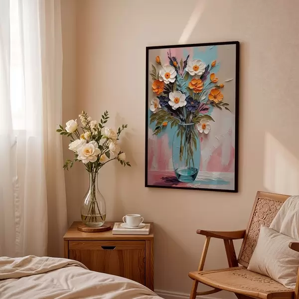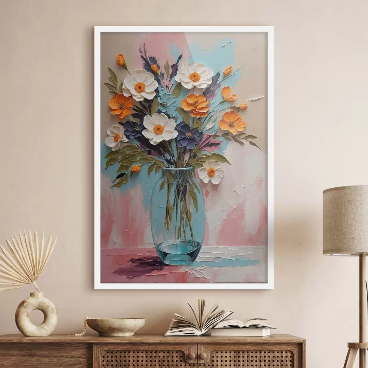 Poster Bloemenboeket in een glazen vaas tegen een kleurrijke achtergrond Nr f48488