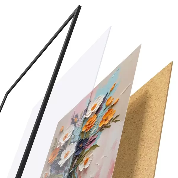 De poster bestaat uit een frame, plexiglas, geprinte afbeelding en spaanplaat achterkant. De poster kan meteen aan de muur worden gehangen dankzij de bevestigingen op de achterkant.