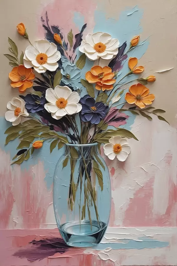 Poster Bloemenboeket in een glazen vaas tegen een kleurrijke achtergrond Nr f48488