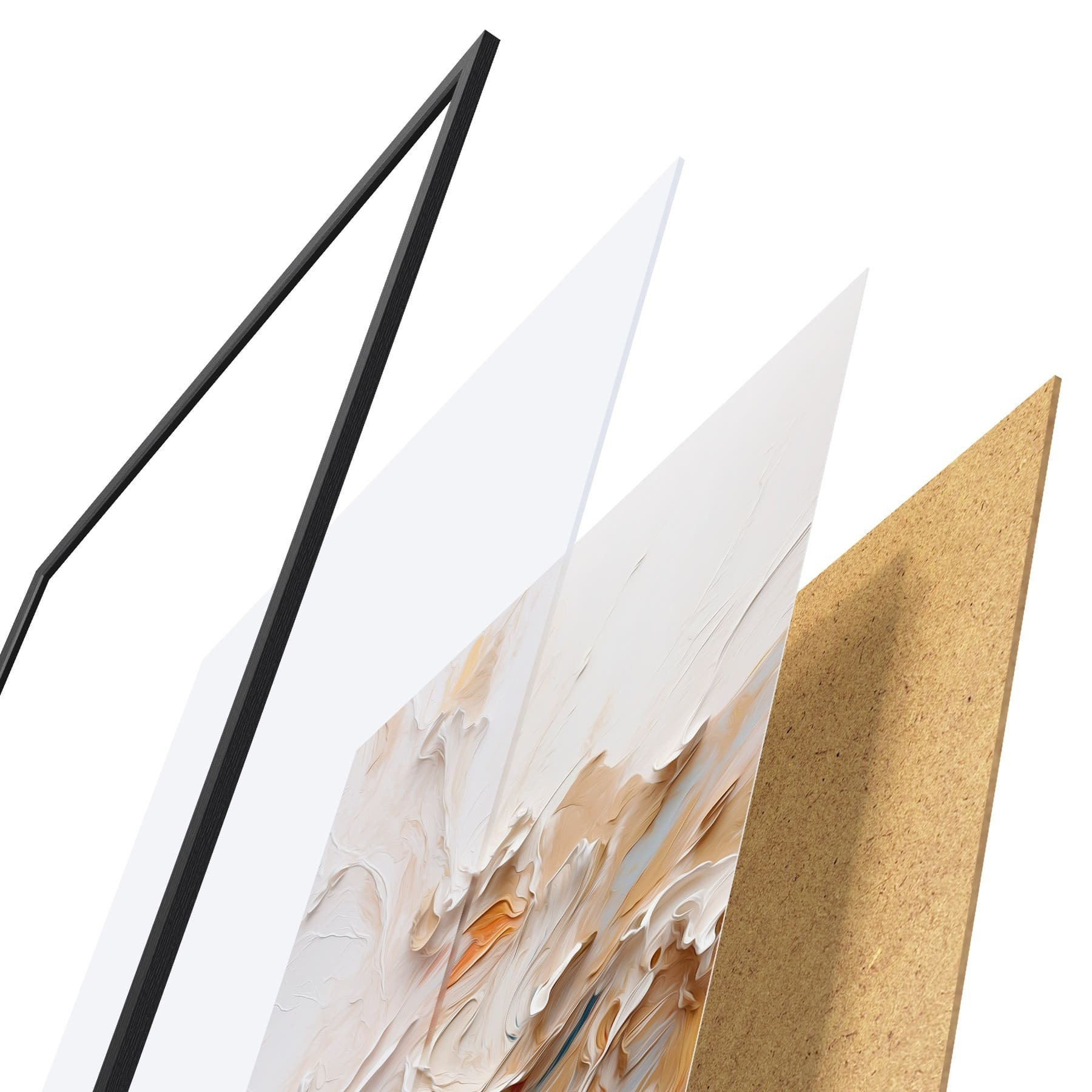 De poster bestaat uit een frame, plexiglas, geprinte afbeelding en spaanplaat achterkant. De poster kan meteen aan de muur worden gehangen dankzij de bevestigingen op de achterkant.