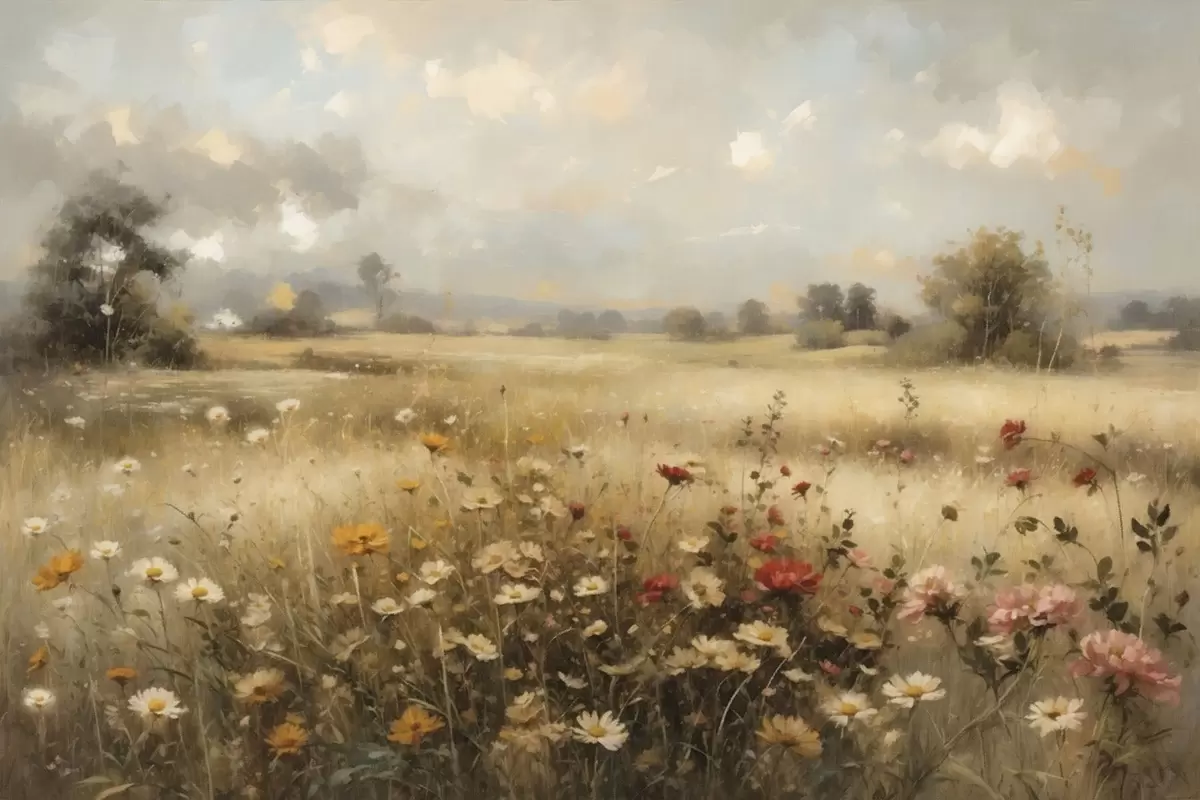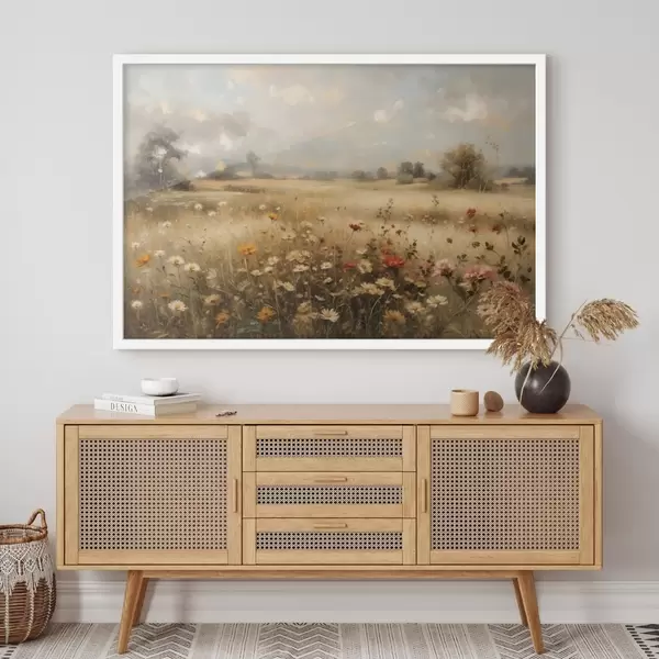 Poster Een veld met wilde bloemen in zacht licht f48491