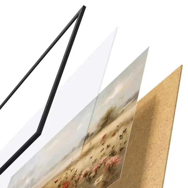 De poster bestaat uit een frame, plexiglas, geprinte afbeelding en spaanplaat achterkant. De poster kan meteen aan de muur worden gehangen dankzij de bevestigingen op de achterkant.
