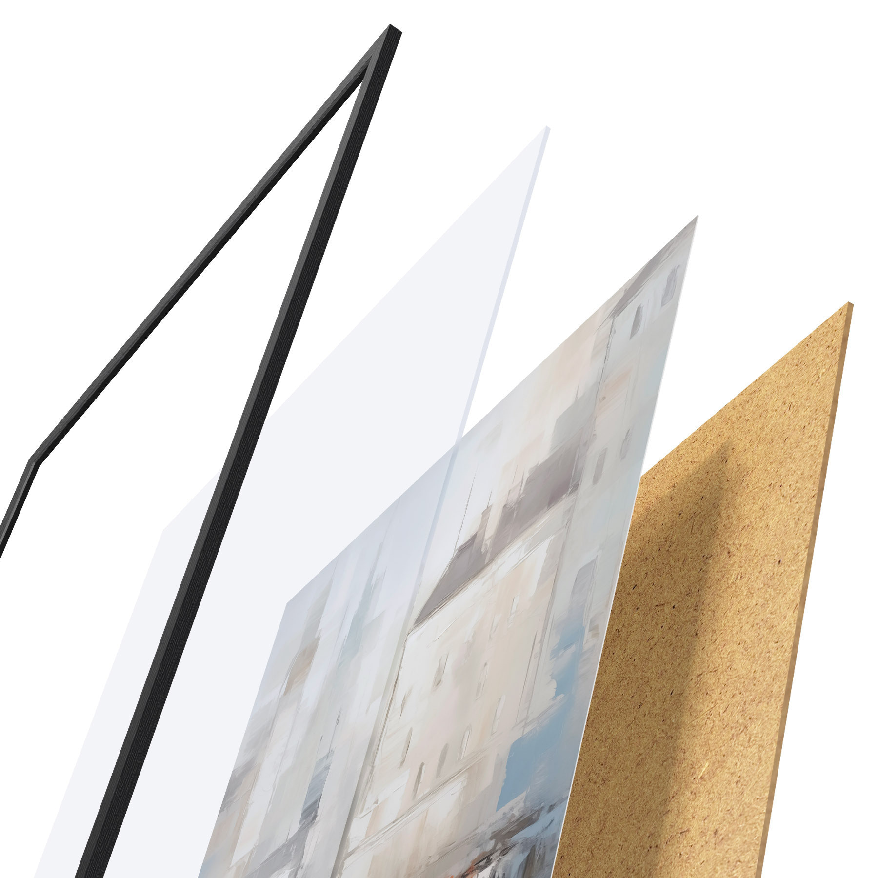 De poster bestaat uit een frame, plexiglas, geprinte afbeelding en spaanplaat achterkant. De poster kan meteen aan de muur worden gehangen dankzij de bevestigingen op de achterkant.