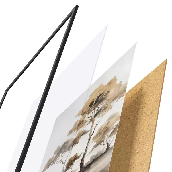 De poster bestaat uit een frame, plexiglas, geprinte afbeelding en spaanplaat achterkant. De poster kan meteen aan de muur worden gehangen dankzij de bevestigingen op de achterkant.