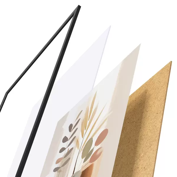 De poster bestaat uit een frame, plexiglas, geprinte afbeelding en spaanplaat achterkant. De poster kan meteen aan de muur worden gehangen dankzij de bevestigingen op de achterkant.