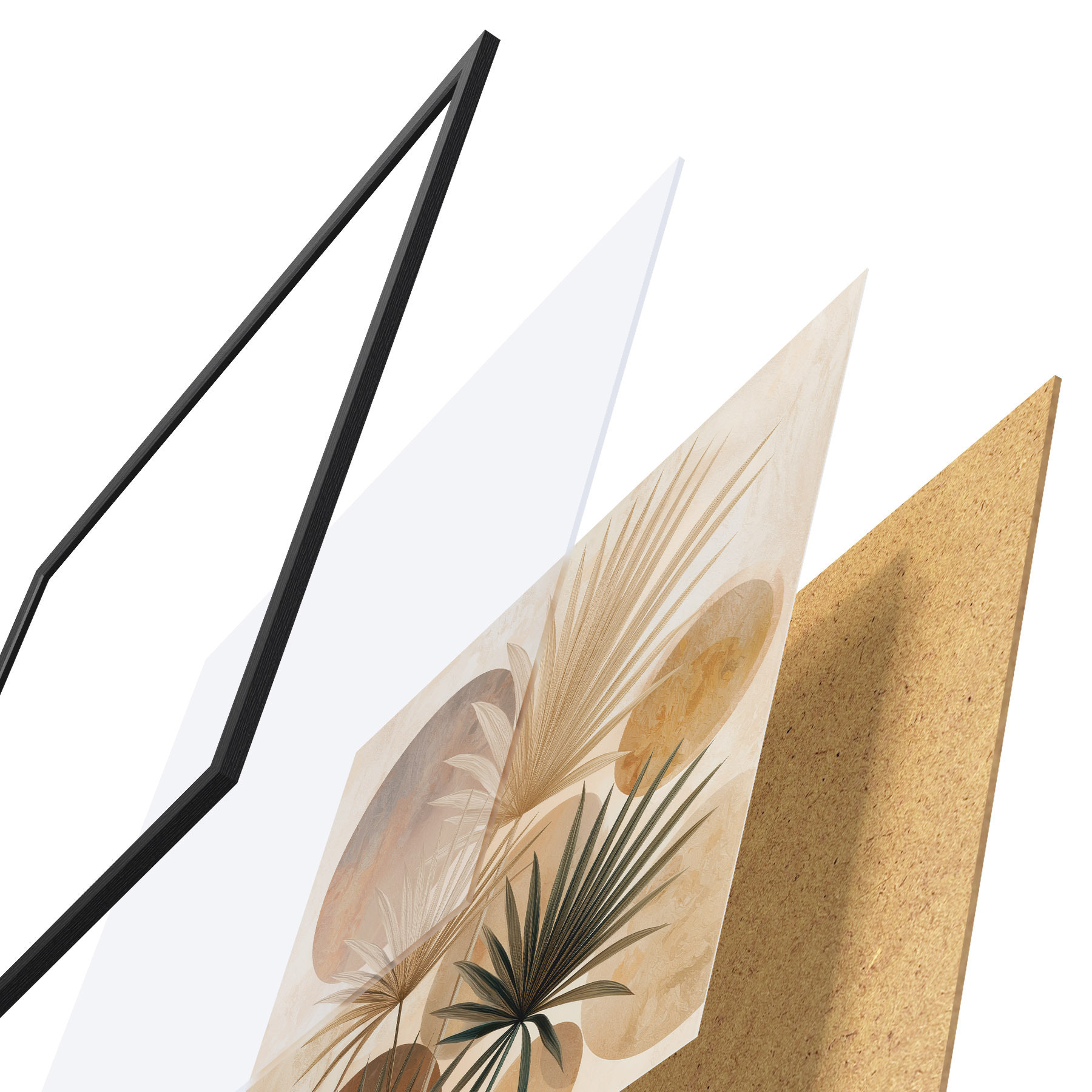 De poster bestaat uit een frame, plexiglas, geprinte afbeelding en spaanplaat achterkant. De poster kan meteen aan de muur worden gehangen dankzij de bevestigingen op de achterkant.