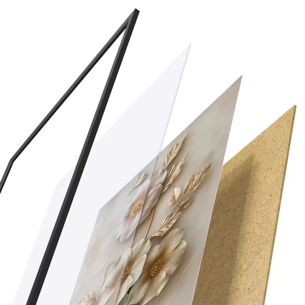 De poster bestaat uit een frame, plexiglas, geprinte afbeelding en spaanplaat achterkant. De poster kan meteen aan de muur worden gehangen dankzij de bevestigingen op de achterkant.