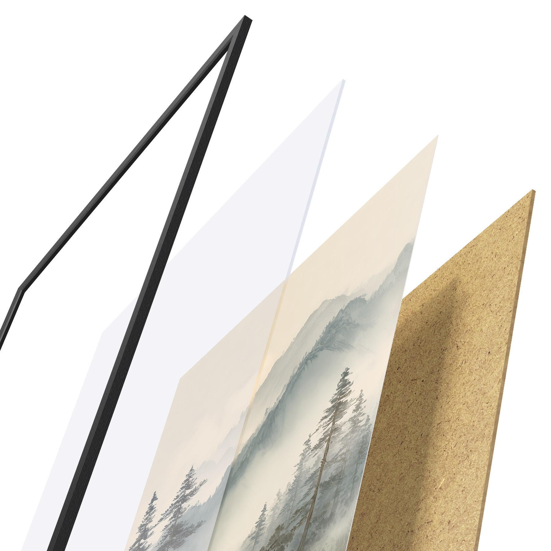 De poster bestaat uit een frame, plexiglas, geprinte afbeelding en spaanplaat achterkant. De poster kan meteen aan de muur worden gehangen dankzij de bevestigingen op de achterkant.
