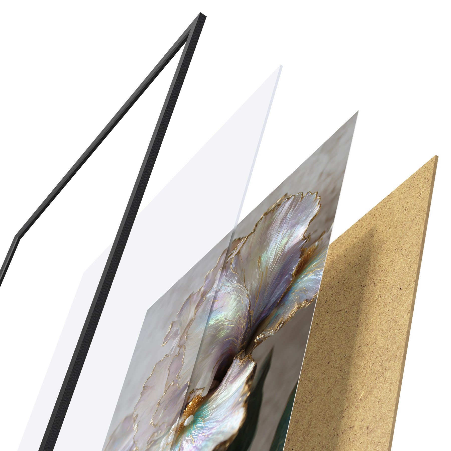 De poster bestaat uit een frame, plexiglas, geprinte afbeelding en spaanplaat achterkant. De poster kan meteen aan de muur worden gehangen dankzij de bevestigingen op de achterkant.