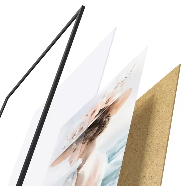 De poster bestaat uit een frame, plexiglas, geprinte afbeelding en spaanplaat achterkant. De poster kan meteen aan de muur worden gehangen dankzij de bevestigingen op de achterkant.