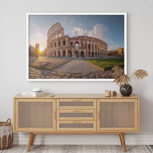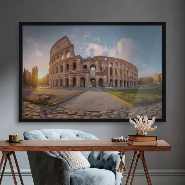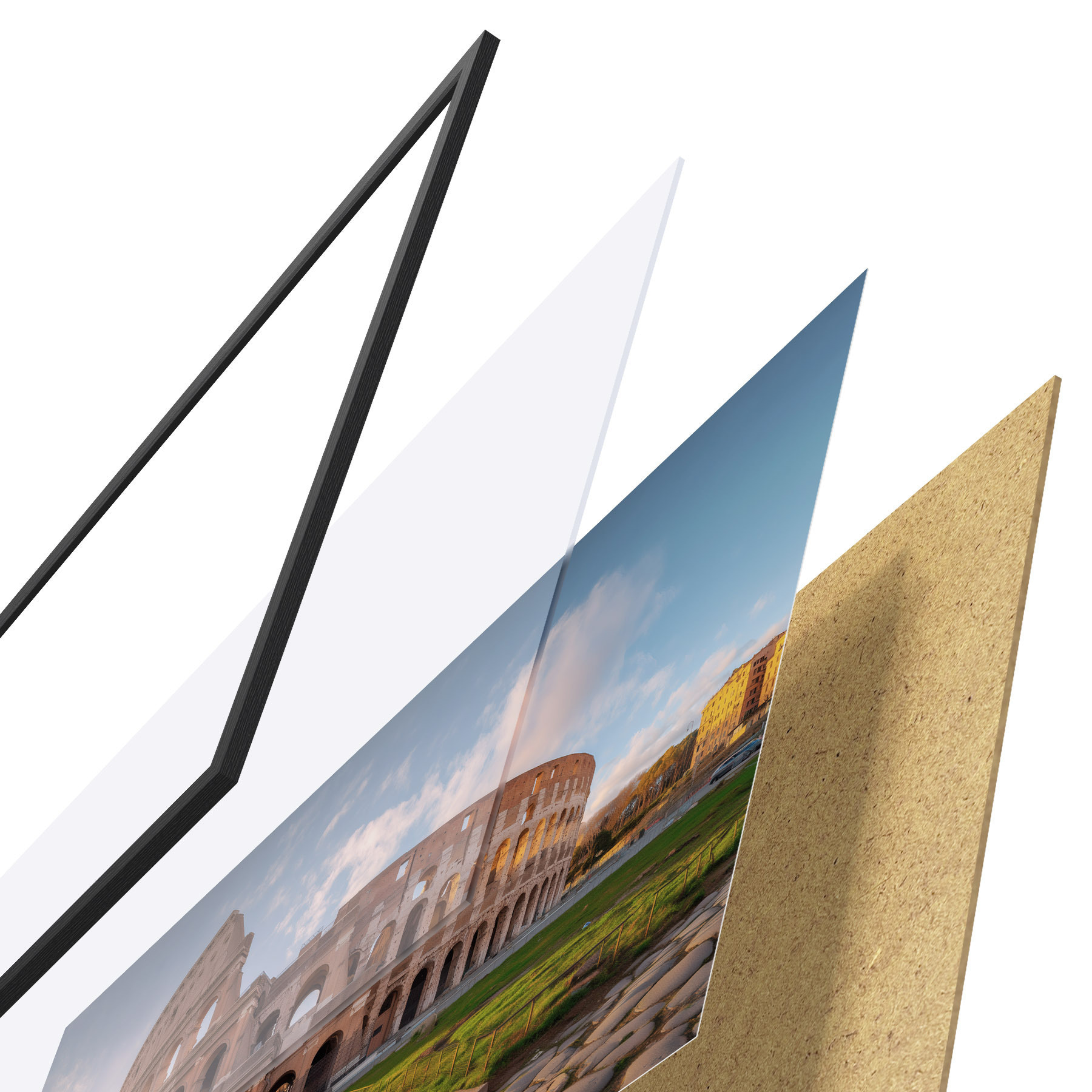 De poster bestaat uit een frame, plexiglas, geprinte afbeelding en spaanplaat achterkant. De poster kan meteen aan de muur worden gehangen dankzij de bevestigingen op de achterkant.