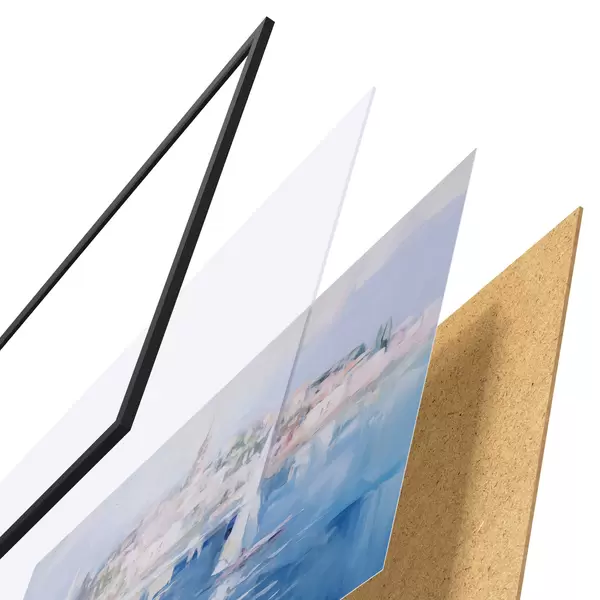 De poster bestaat uit een frame, plexiglas, geprinte afbeelding en spaanplaat achterkant. De poster kan meteen aan de muur worden gehangen dankzij de bevestigingen op de achterkant.