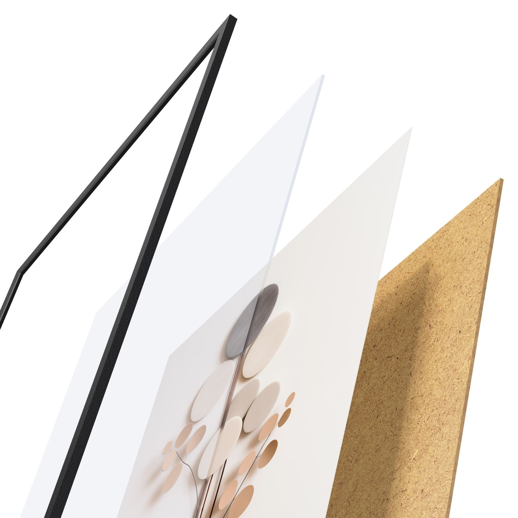 De poster bestaat uit een frame, plexiglas, geprinte afbeelding en spaanplaat achterkant. De poster kan meteen aan de muur worden gehangen dankzij de bevestigingen op de achterkant.