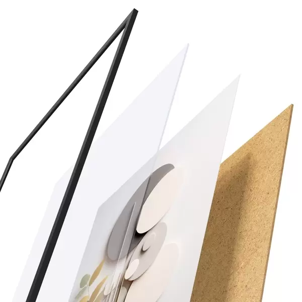 De poster bestaat uit een frame, plexiglas, geprinte afbeelding en spaanplaat achterkant. De poster kan meteen aan de muur worden gehangen dankzij de bevestigingen op de achterkant.