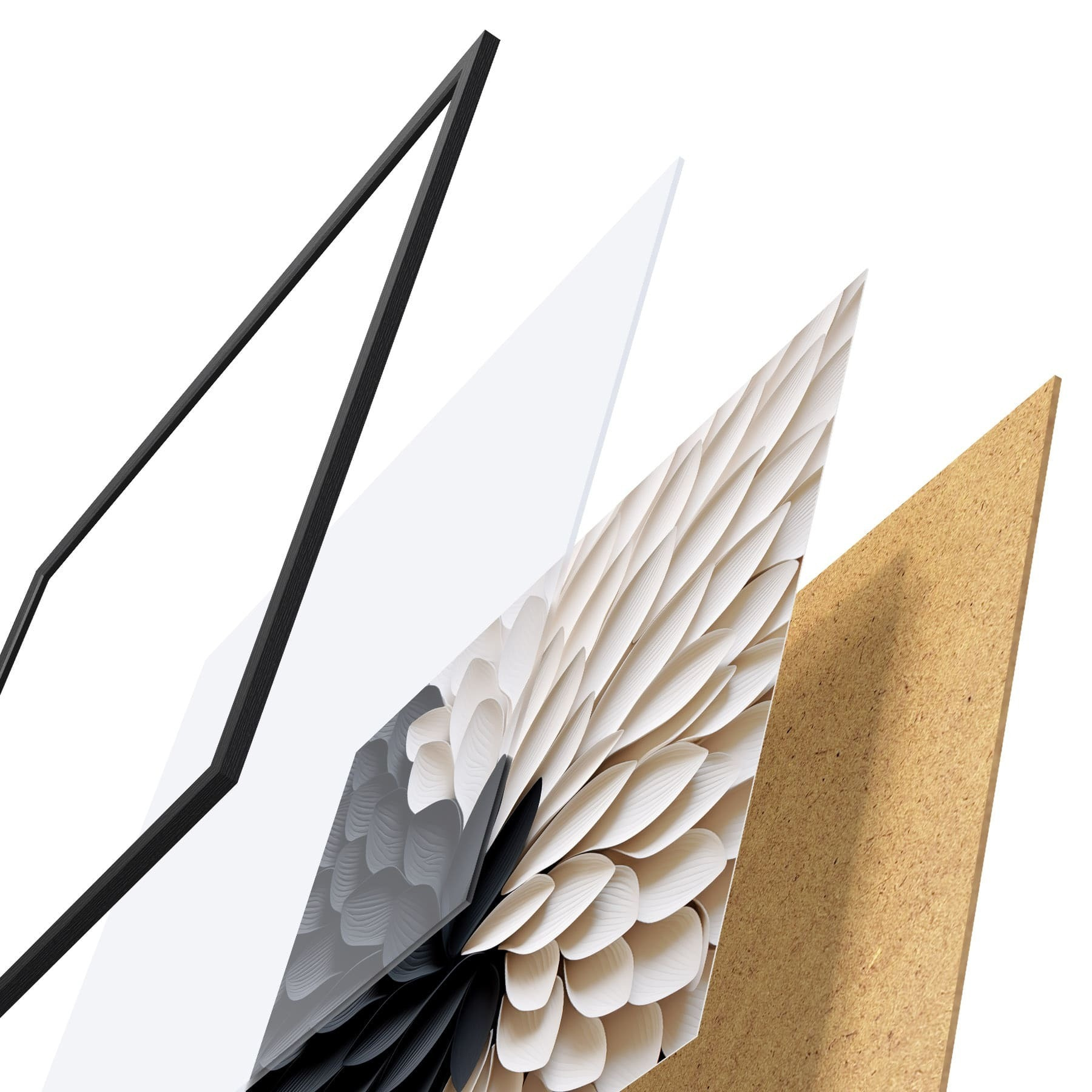 De poster bestaat uit een frame, plexiglas, geprinte afbeelding en spaanplaat achterkant. De poster kan meteen aan de muur worden gehangen dankzij de bevestigingen op de achterkant.