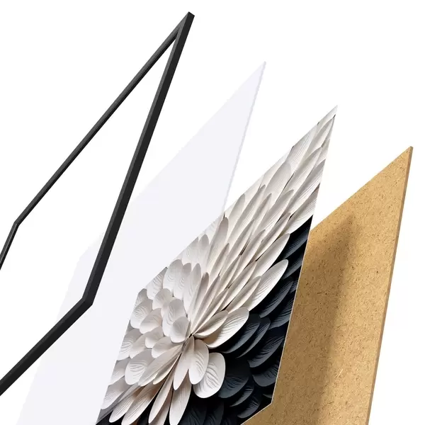 De poster bestaat uit een frame, plexiglas, geprinte afbeelding en spaanplaat achterkant. De poster kan meteen aan de muur worden gehangen dankzij de bevestigingen op de achterkant.