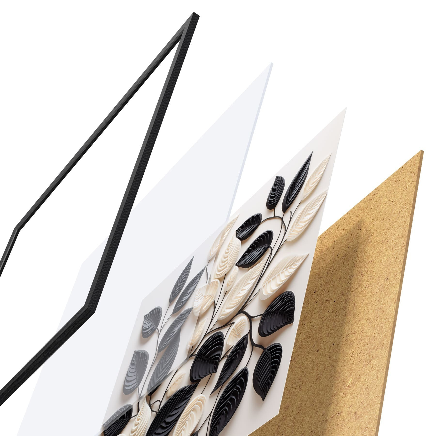 De poster bestaat uit een frame, plexiglas, geprinte afbeelding en spaanplaat achterkant. De poster kan meteen aan de muur worden gehangen dankzij de bevestigingen op de achterkant.