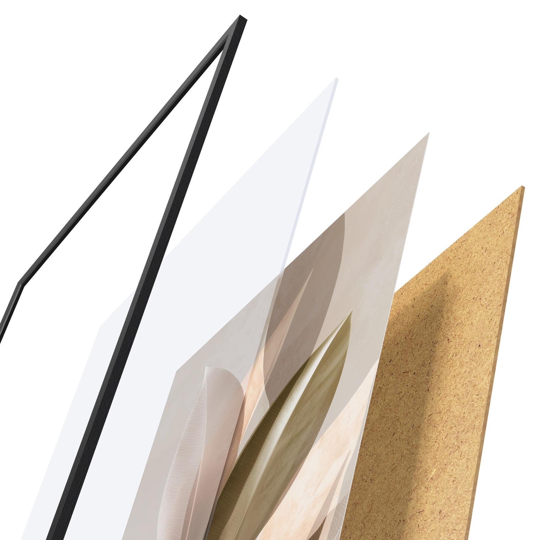 De poster bestaat uit een frame, plexiglas, geprinte afbeelding en spaanplaat achterkant. De poster kan meteen aan de muur worden gehangen dankzij de bevestigingen op de achterkant.