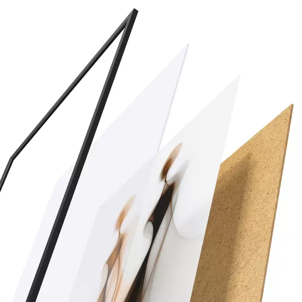 De poster bestaat uit een frame, plexiglas, geprinte afbeelding en spaanplaat achterkant. De poster kan meteen aan de muur worden gehangen dankzij de bevestigingen op de achterkant.