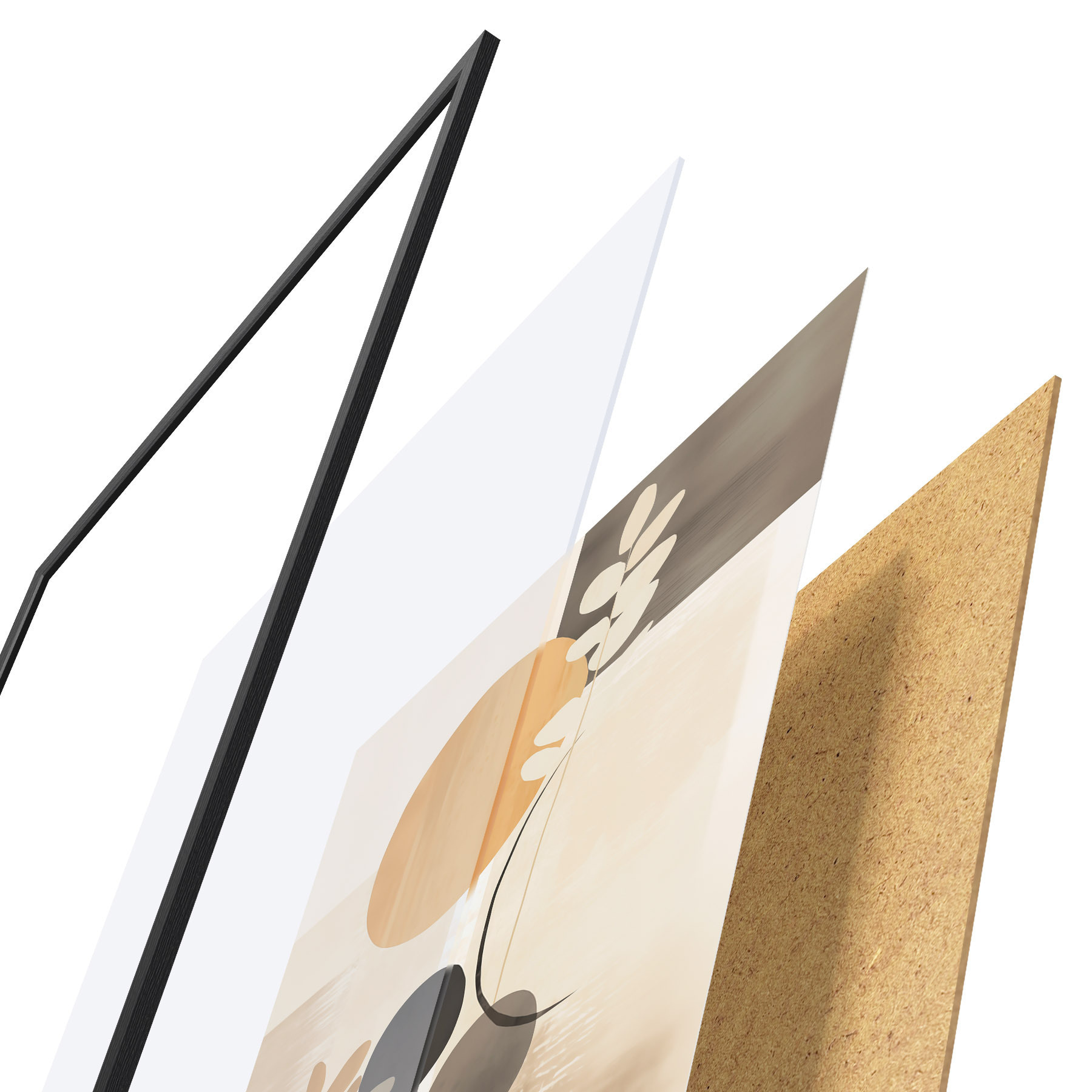 De poster bestaat uit een frame, plexiglas, geprinte afbeelding en spaanplaat achterkant. De poster kan meteen aan de muur worden gehangen dankzij de bevestigingen op de achterkant.