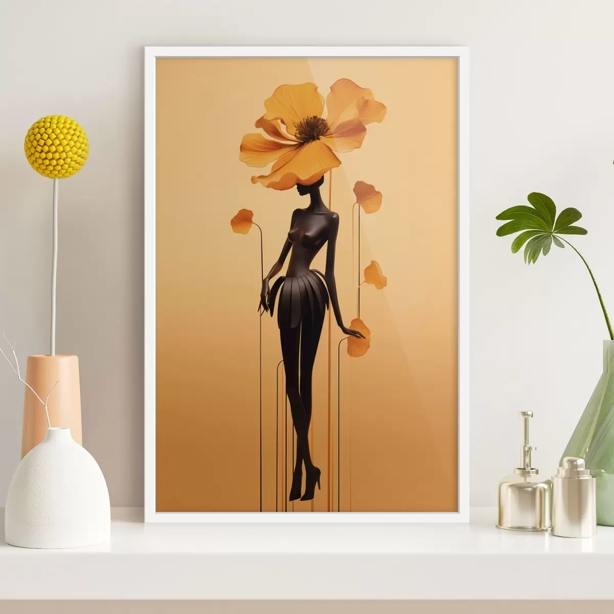 Poster Elegant figuur met bloemen tegen een warme achtergrond met kleurverloop Nr f48619
