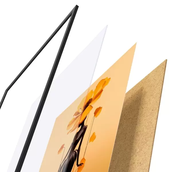 De poster bestaat uit een frame, plexiglas, geprinte afbeelding en spaanplaat achterkant. De poster kan meteen aan de muur worden gehangen dankzij de bevestigingen op de achterkant.