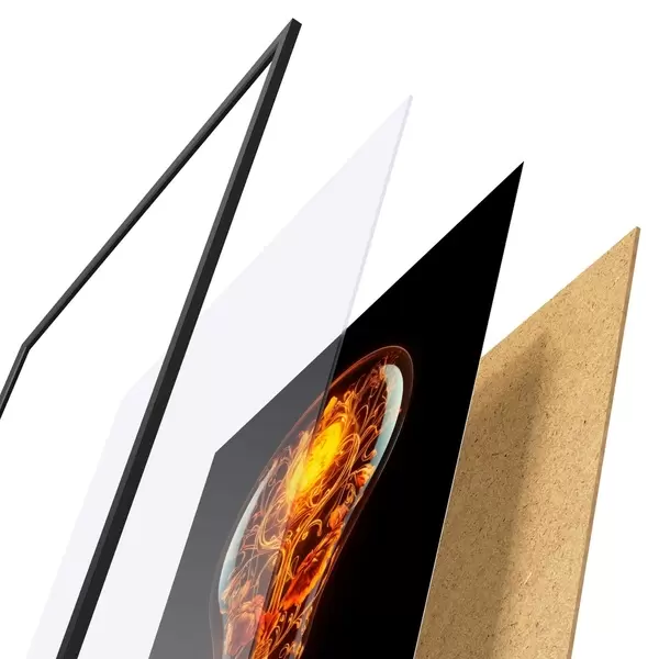 De poster bestaat uit een frame, plexiglas, geprinte afbeelding en spaanplaat achterkant. De poster kan meteen aan de muur worden gehangen dankzij de bevestigingen op de achterkant.