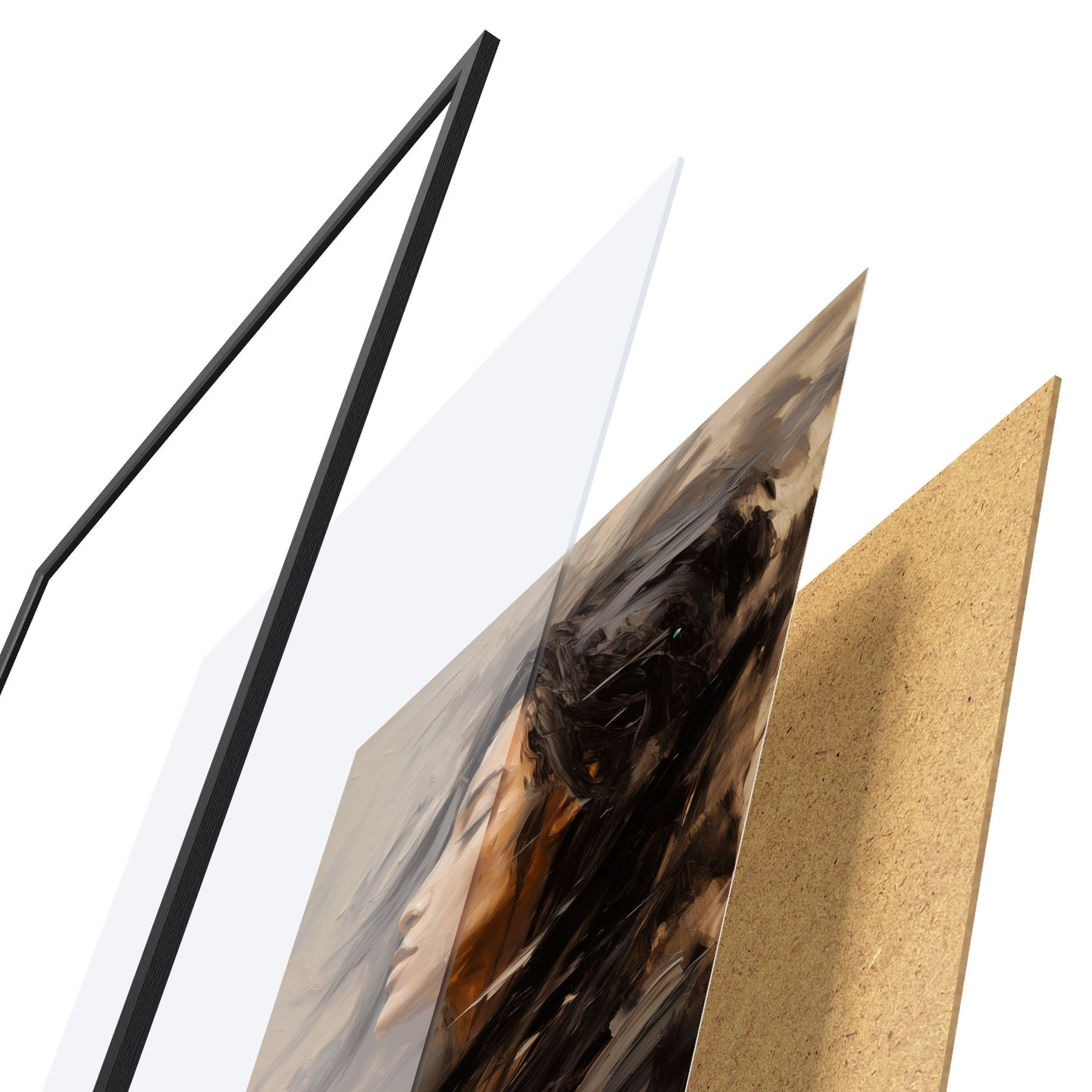 De poster bestaat uit een frame, plexiglas, geprinte afbeelding en spaanplaat achterkant. De poster kan meteen aan de muur worden gehangen dankzij de bevestigingen op de achterkant.
