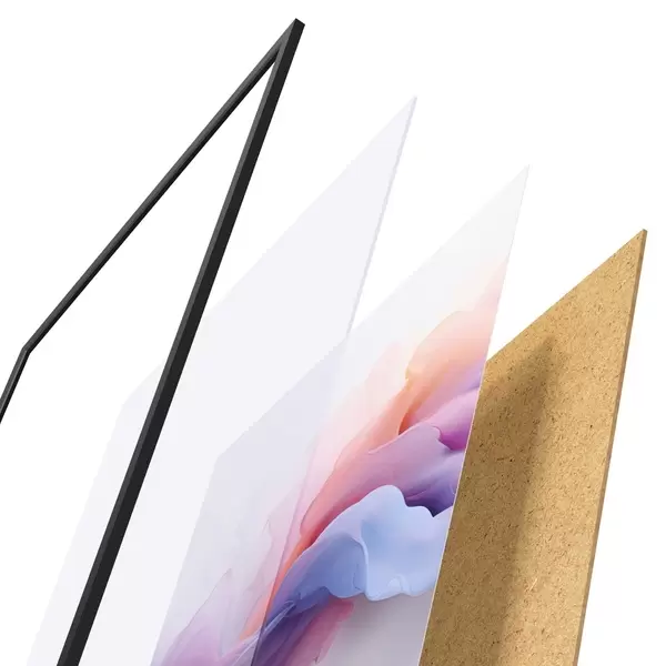 De poster bestaat uit een frame, plexiglas, geprinte afbeelding en spaanplaat achterkant. De poster kan meteen aan de muur worden gehangen dankzij de bevestigingen op de achterkant.