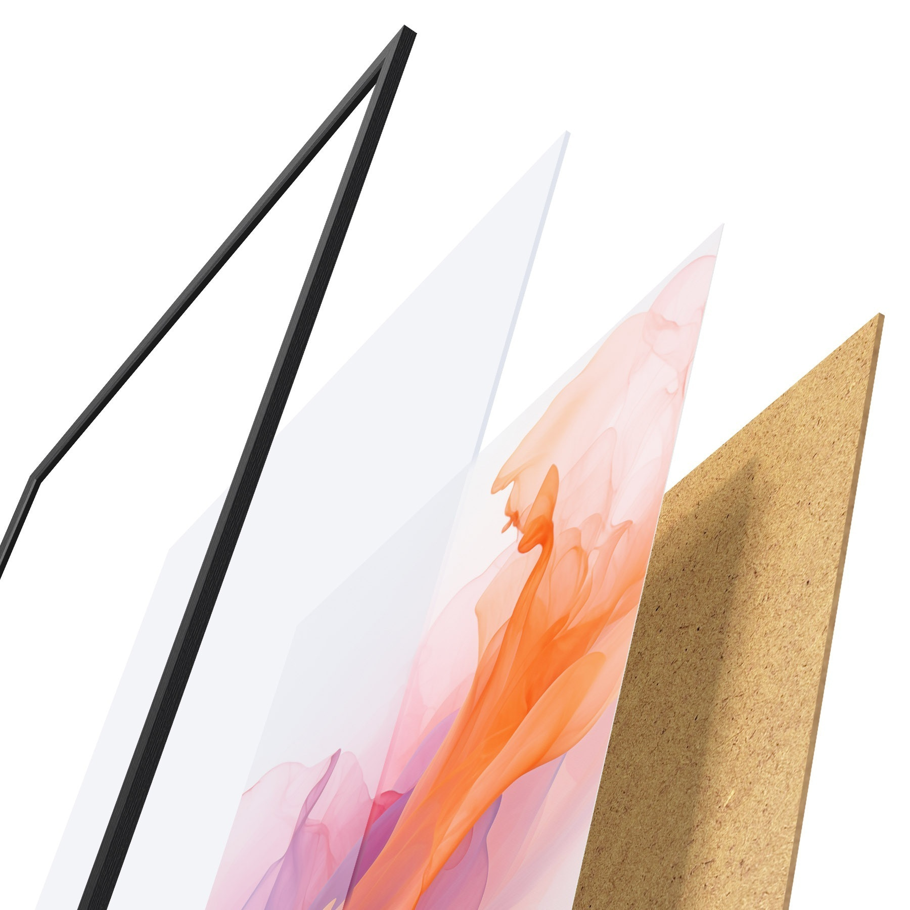 De poster bestaat uit een frame, plexiglas, geprinte afbeelding en spaanplaat achterkant. De poster kan meteen aan de muur worden gehangen dankzij de bevestigingen op de achterkant.