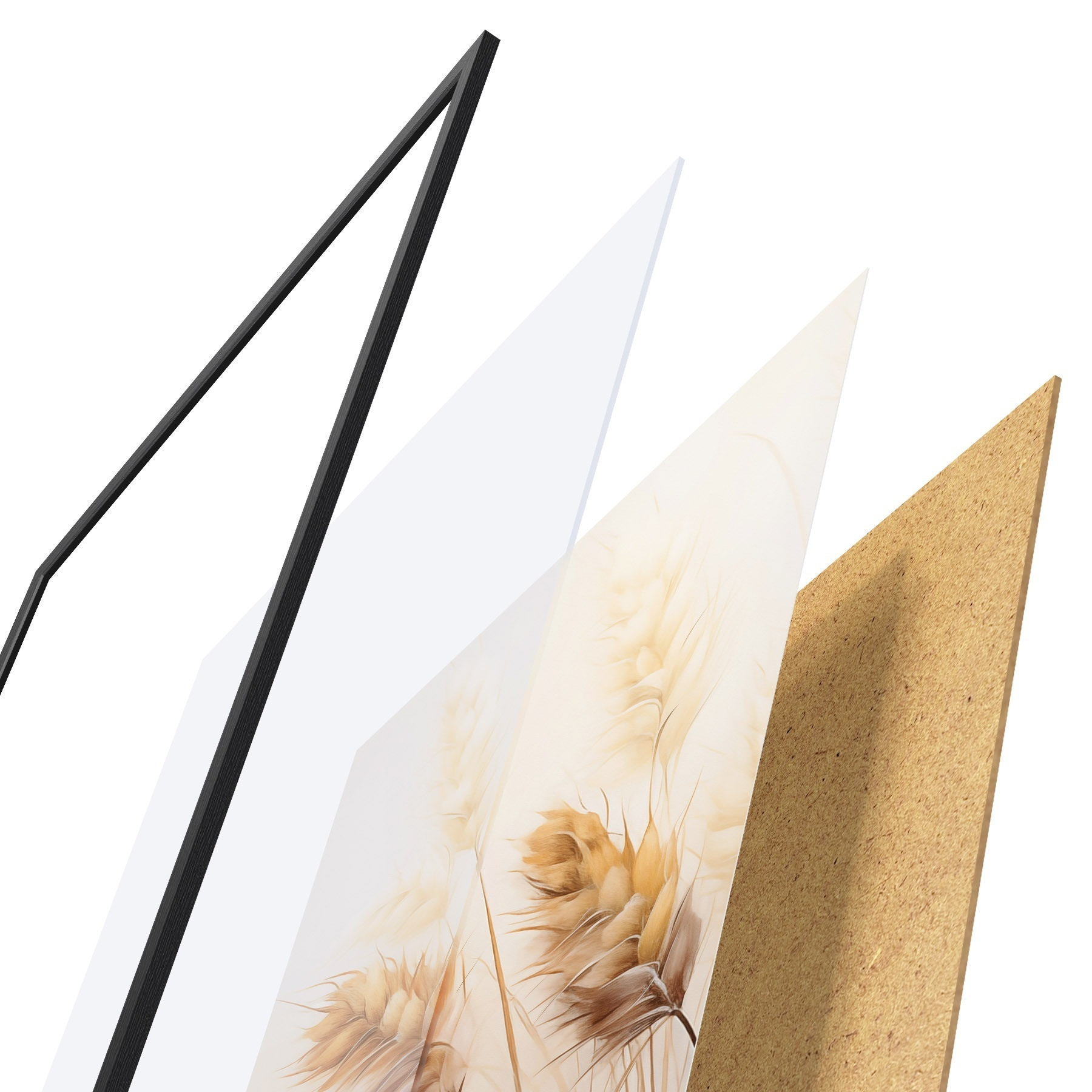 De poster bestaat uit een frame, plexiglas, geprinte afbeelding en spaanplaat achterkant. De poster kan meteen aan de muur worden gehangen dankzij de bevestigingen op de achterkant.