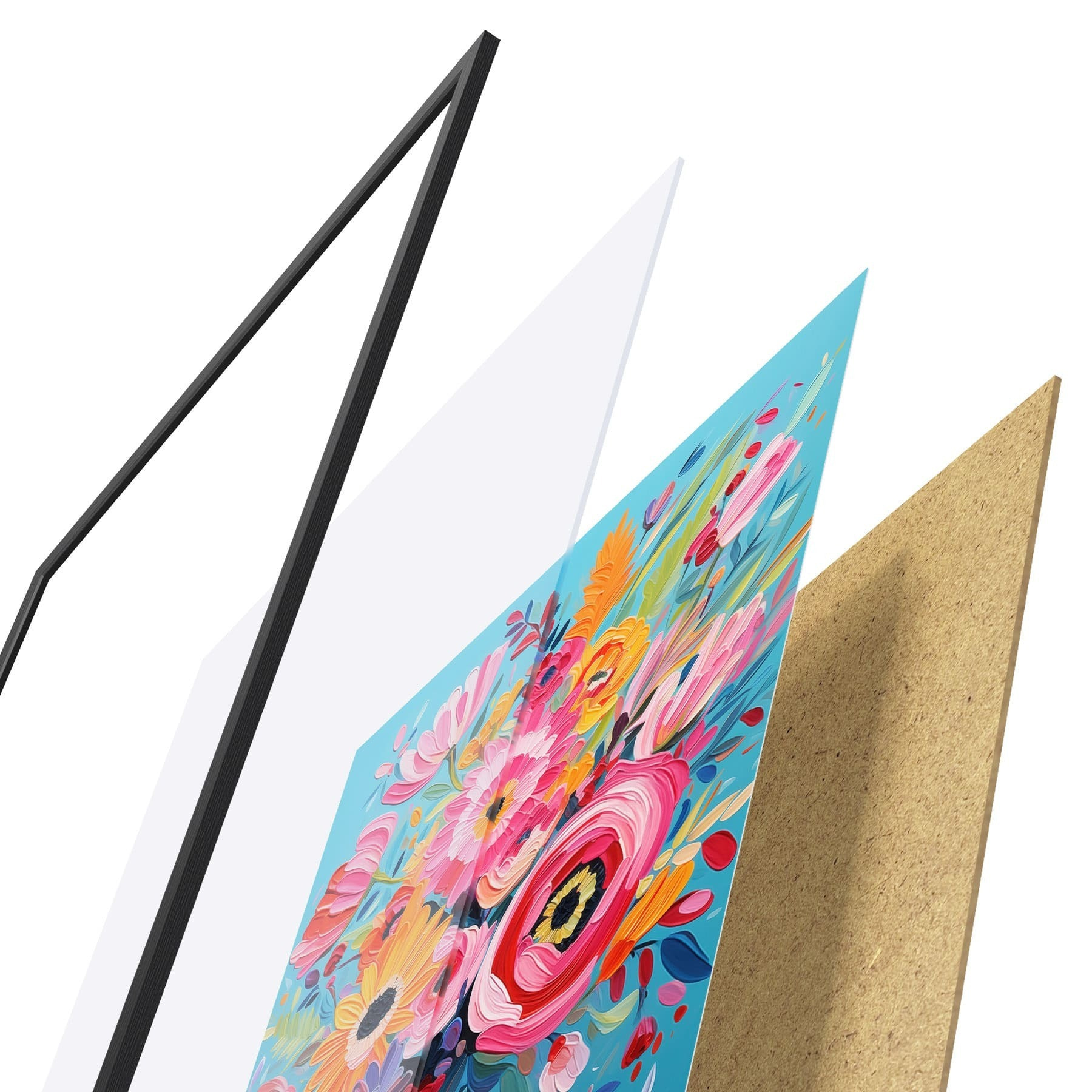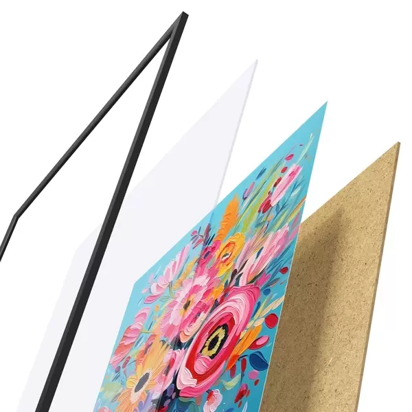 De poster bestaat uit een frame, plexiglas, geprinte afbeelding en spaanplaat achterkant. De poster kan meteen aan de muur worden gehangen dankzij de bevestigingen op de achterkant.