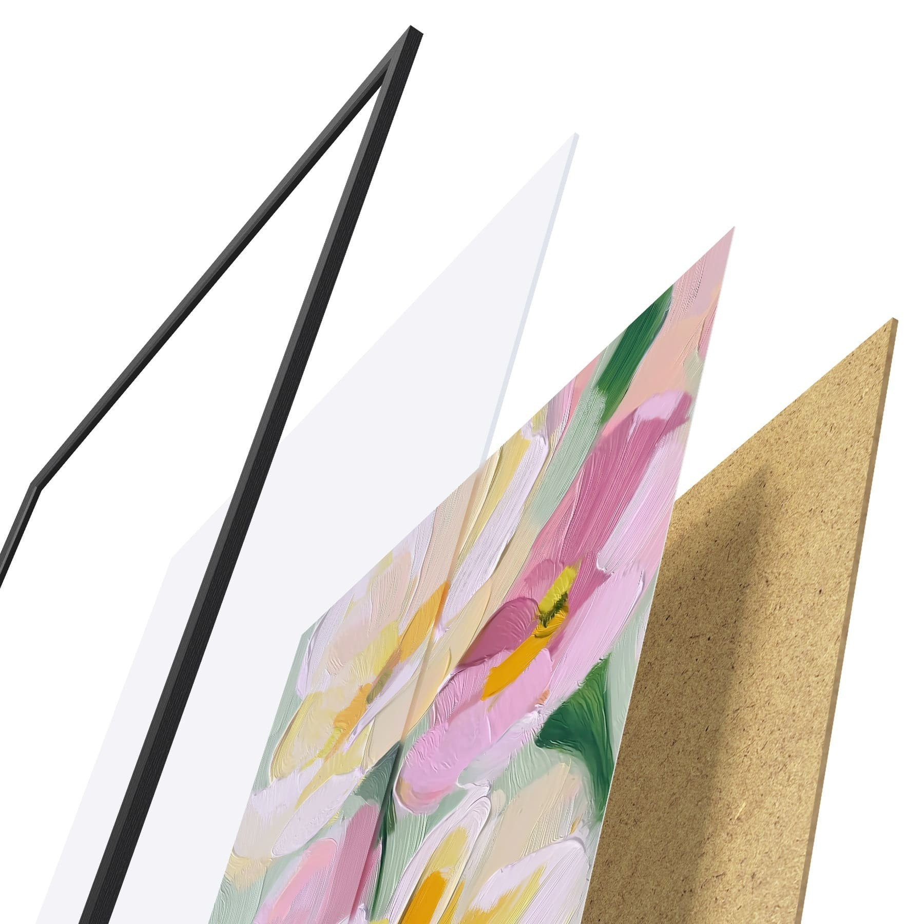 De poster bestaat uit een frame, plexiglas, geprinte afbeelding en spaanplaat achterkant. De poster kan meteen aan de muur worden gehangen dankzij de bevestigingen op de achterkant.